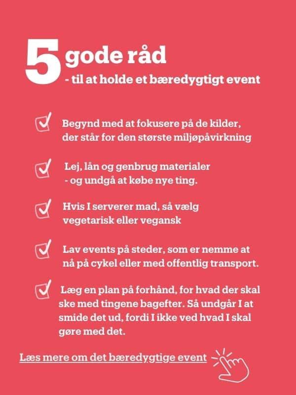 Når det gælder den praktiske og logistiske afvikling af events, forsøger vi altid at gøre det så klimaneutralt som muligt. F.eks. opfordrer vi deltagerne til at komme frem vha. offentlig transport, og vi undlader at bruge engangsservice og engangspynt.