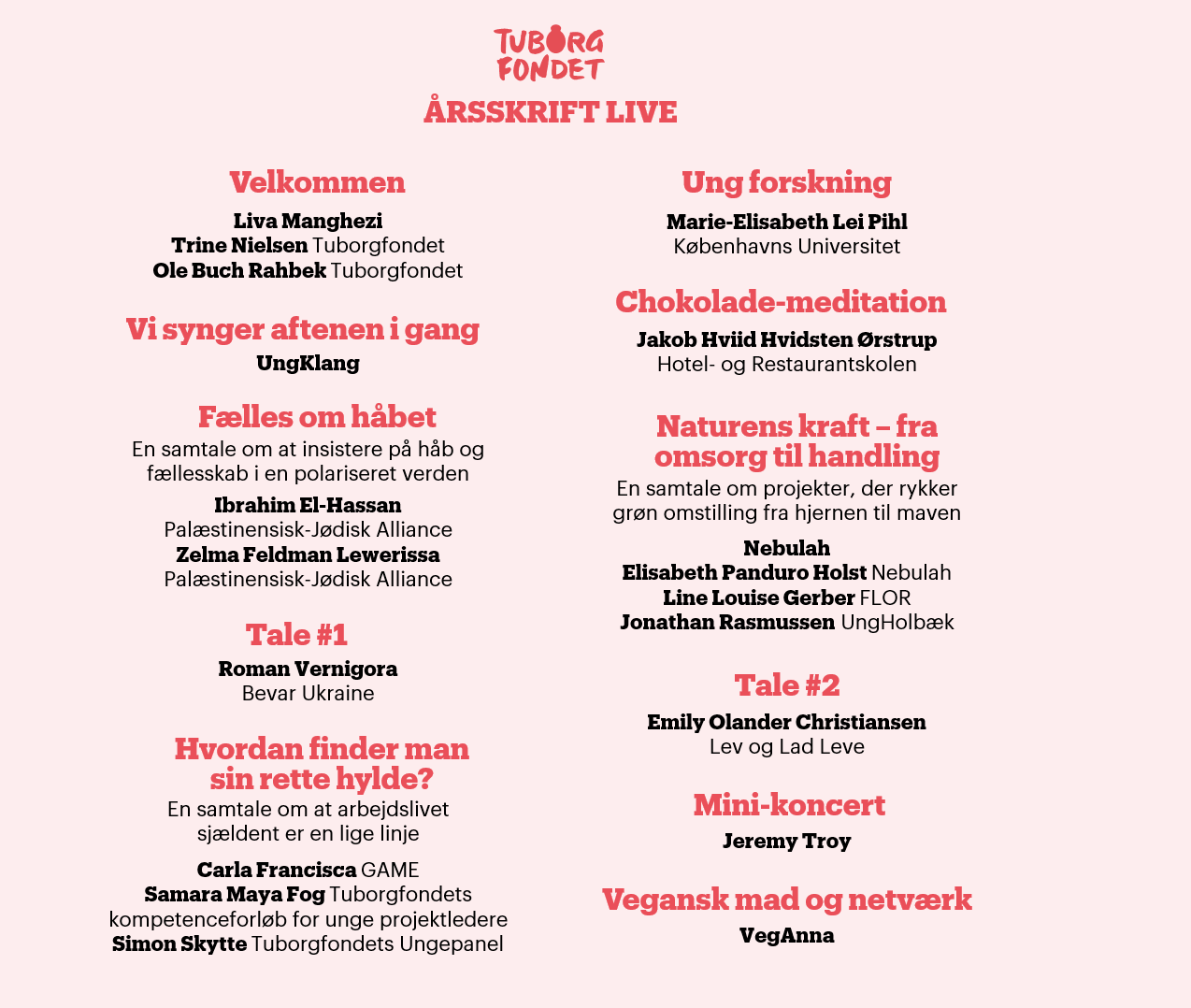 Traditionen tro inviterer Tuborgfondet til en festlig eftermiddag og aften, hvor vi sammen ser tilbage på året der gik med unges drømme i centrum. Årsskrift Live er et miks af debatter, samtaler og selvfølgelig live-musik.