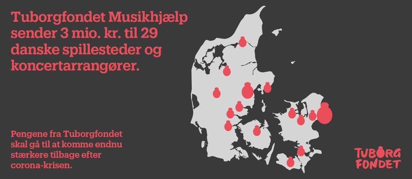 Selvom de fleste spillesteder lige nu er lukket helt ned, er der alligevel noget at glæde sig til for danske musikelskere. Tuborgfondet Musikhjælp afslutter 2020 med at sende 3,2 mio. kr. afsted til i alt 29 danske spillesteder og koncertarrangører, og pengene skal bruges til at komme endnu stærkere tilbage end før Corona.