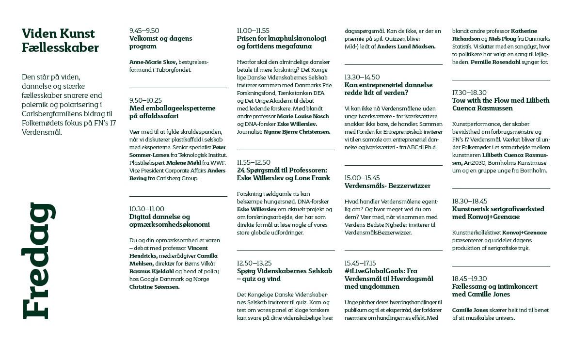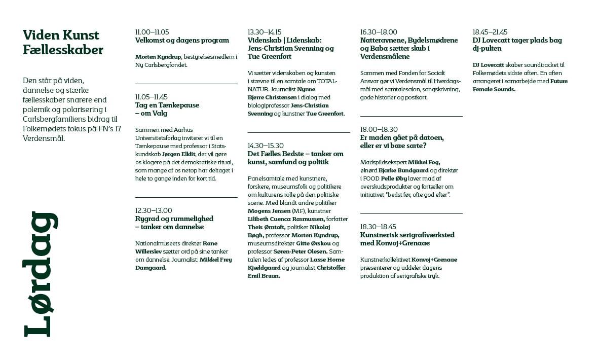 Mød blandt andre Eske Willerslev, Tue Greenfort, Ida Auken, Rebecca Adler-Nissen, Lilibeth Cuenca Rasmussen, Vincent Hendricks, Verdens Bedste Nyheder, Gitte Ørskou, Lasse Horne Kjældgaard, Pernille Rosendahl, Jens-Christian Svenning, Lone Frank, Rane Willerslev, Peter Birch Sørensen, Tommy Ahlers, Mogens Jensen, I Love Global Goals, Nynne Bjerre Christensen, Natteravnene, Verdens Bedste Nyheder og mange flere. Se det fulde program her: LINK