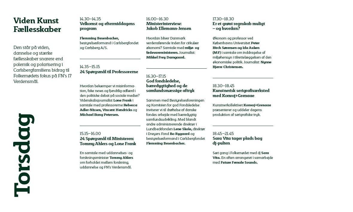 Ambitionen med Carlsbergfamiliens program er at slå et slag for de klassiske dannelsesidealer; at skabe et rum for refleksion, dialog og indsigt blandt Folkemødets mange og hurtige meninger og diskussioner. Carlsbergfamiliens engagement i Folkemødet ligger i den overbevisning, at den sunde, konstruktive debat altid bør hvile på et fundament af viden og indsigt. Derfor lader vi eksperterne komme til orde i et format, der giver ro til den nysgerrige fordybelse. Invitationen til fordybelse ligger ligeledes i kunsten, som i form af kunstperformance, artist talks, museumsfagligheder og minikoncerter er massivt til stede i Tabernaklet. Derudover gør vi plads til fællesskab, når vi undervejs giver ordet til ungdommen og får unges perspektiver på iværksætteri, bæredygtighed og musik. Samtlige indslag i Carlsbergfamiliens program forholder sig løst som fast til den overordnede ramme for årets Folkemøde, nemlig FN’s 17 verdensmål.